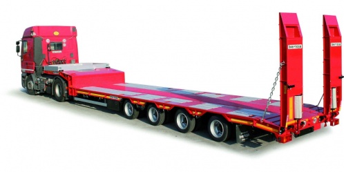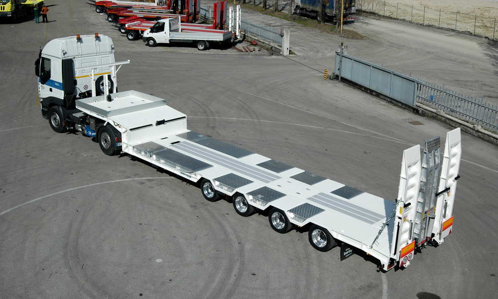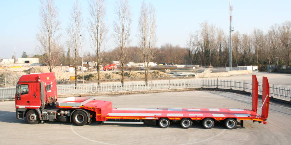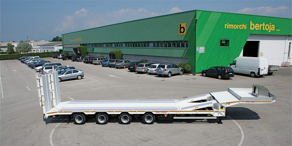 Semirimorchio bertoja ribassato gommato 205/65/R17.5 per trattori 2 assi legali. Massa complessiva di 368 q.li. Per il trasporto di cose/macchine operatrici. Sospensioni pneumatiche. Rampe a molla o idrauliche. Terzo e quarto asse autosterzante. Primo asse sollevabile. Veicolo particolarmente versatile a cui è possibile aggiungere la quasi totalità di accessori e configurazioni di seguito alcuni esempi: Verricello idraulico disponibile in tre posizioni ed anche incassato Sponde piano alto e piano basso. Rampe per salita carico su piano alto. Ribassamenti aggiuntivi del telaio per trasporto gommati e relative coperture leggere e facilmente smontabili. Allargatori del piano di carico Misure e portate su richiesta