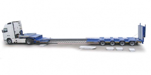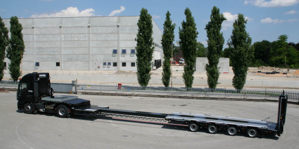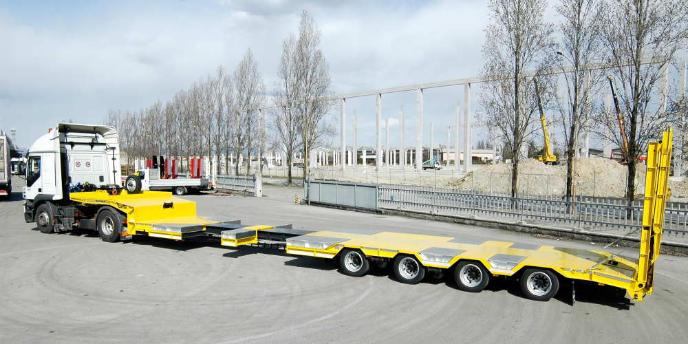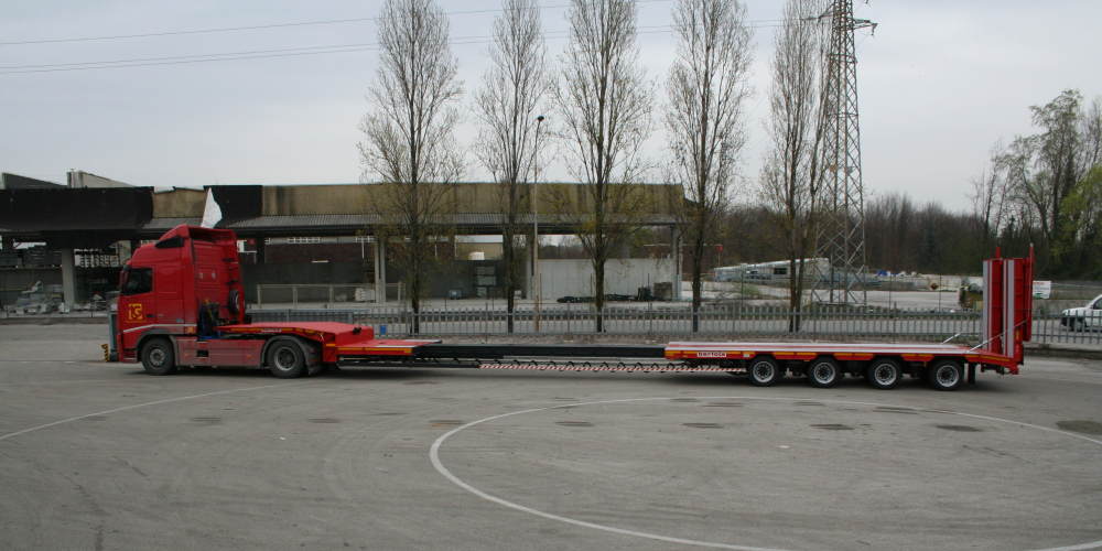 Semirimorcho bertoja ribassato allungabile gommato 205/65/R17.5 per trattori 2 assi legali. Massa complessiva di 368 q.li. Per il trasporto di cose/macchine operatrici. Sospensioni pneumatiche. Rampe a molla o idrauliche. Secondo e terzo asse autosterzante. Primo asse sollevabile. Possibilità di allungamento del piano di carico ad intervalli di sfilo. Veicolo particolarmente versatile a cui è possibile aggiungere la quasi totalità di accessori e configurazioni. Di seguito alcuni esempi: Verricello idraulico disponibile in tre posizioni ed anche incassato. Sponde piano alto e piano basso. Rampe per salita carico su piano alto. Ribassamenti aggiuntivi del telaio per trasporto gommati e relative coperture leggere e facilmente smontabili. Allargatori del piano di carico. Misure e portate su richiesta